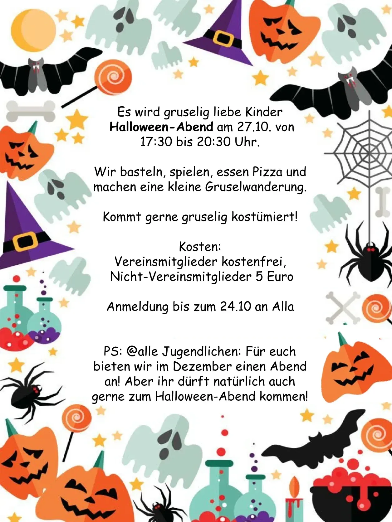 Wir basteln, spielen, essen Pizza und machen eine kleine Gruselwanderung. Kommt gerne