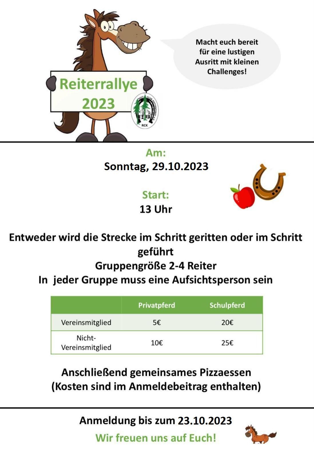 Am Sonntag 29. Oktober findet die Reiterrallye des RCk statt. Start ist um 13 Uhr. Danach essen wir gemeinsam Pizza. Vereinsmitgleider und Nichtmitglieder können mitmachen.