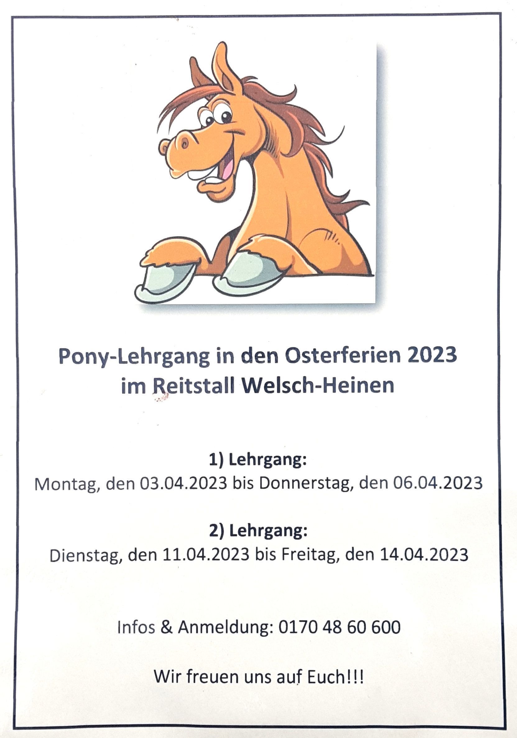Der RCK bietet in den Osterferien NRW 2023 wieder Pony-Lehrgänge im dem Reitstall Welsch-Heinen an, jeweils in der Woche vor und nach Ostern.