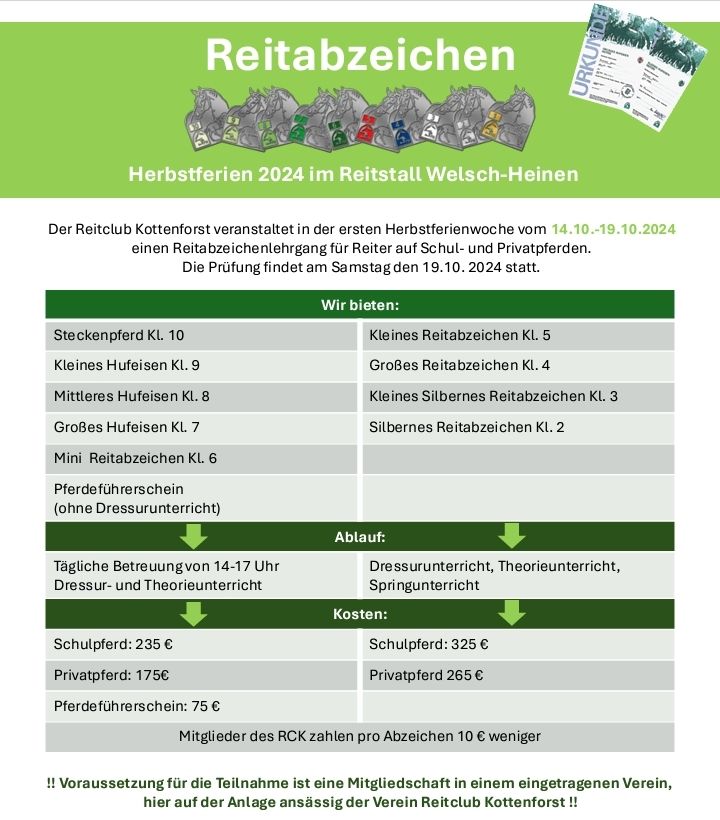 einen Reitabzeichenlehrgang für Reiter auf Schul- und Privatpferden. Die Prüfung findet am Samstag den 19.10. 2024 statt.